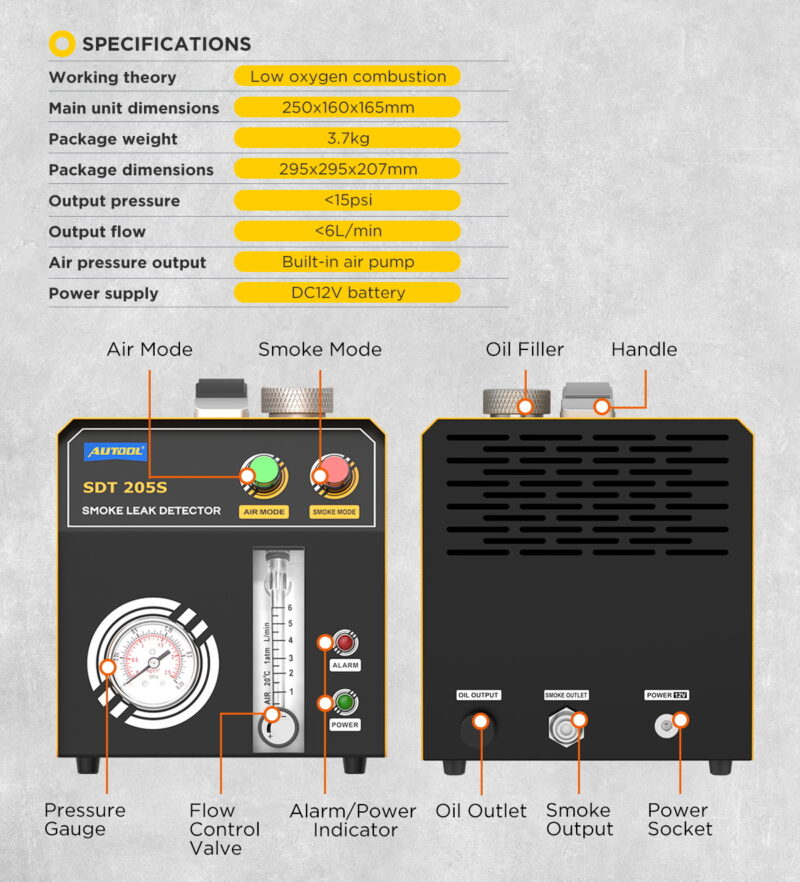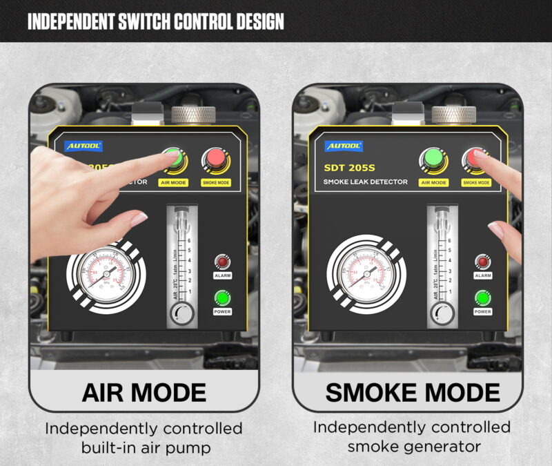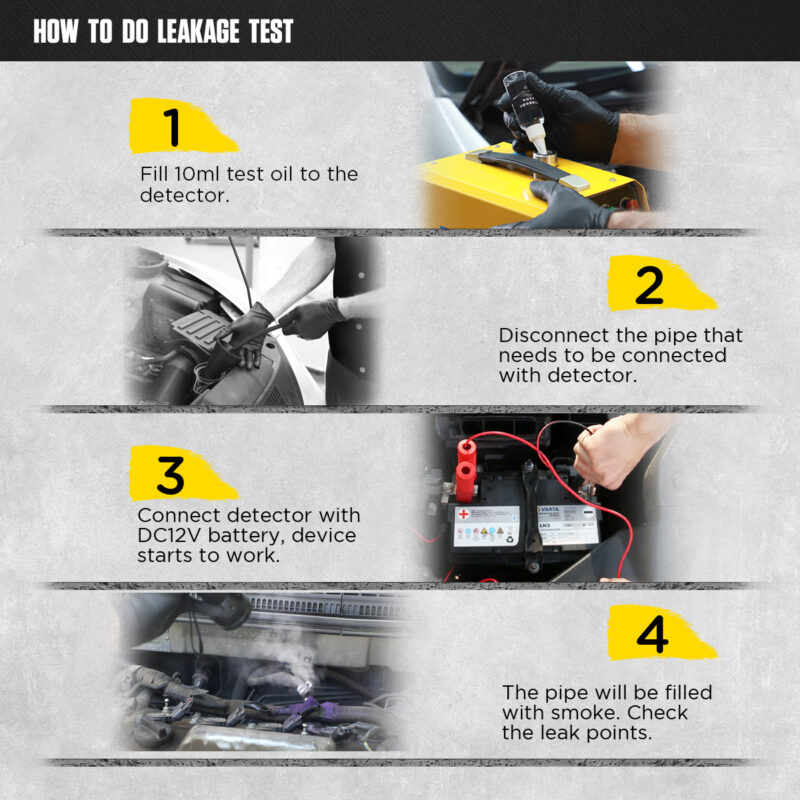 ΕΥΕΛΙΚΤΟΣ ΔΙΑΓΝΩΣΤΙΚΟΣ ΕΛΕΓΧΟΣΗ συσκευή παράγει καπνό στη βέλτιστη πίεση (έως 15 PSI / περίπου 1 bar), επιτρέποντας την ασφαλή δοκιμή των περισσότερων συστημάτων σε επιβατικά αυτοκίνητα, ημιφορτηγά και μοτοσικλέτες. Κύριοι τομείς ελέγχου: